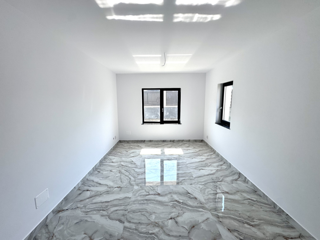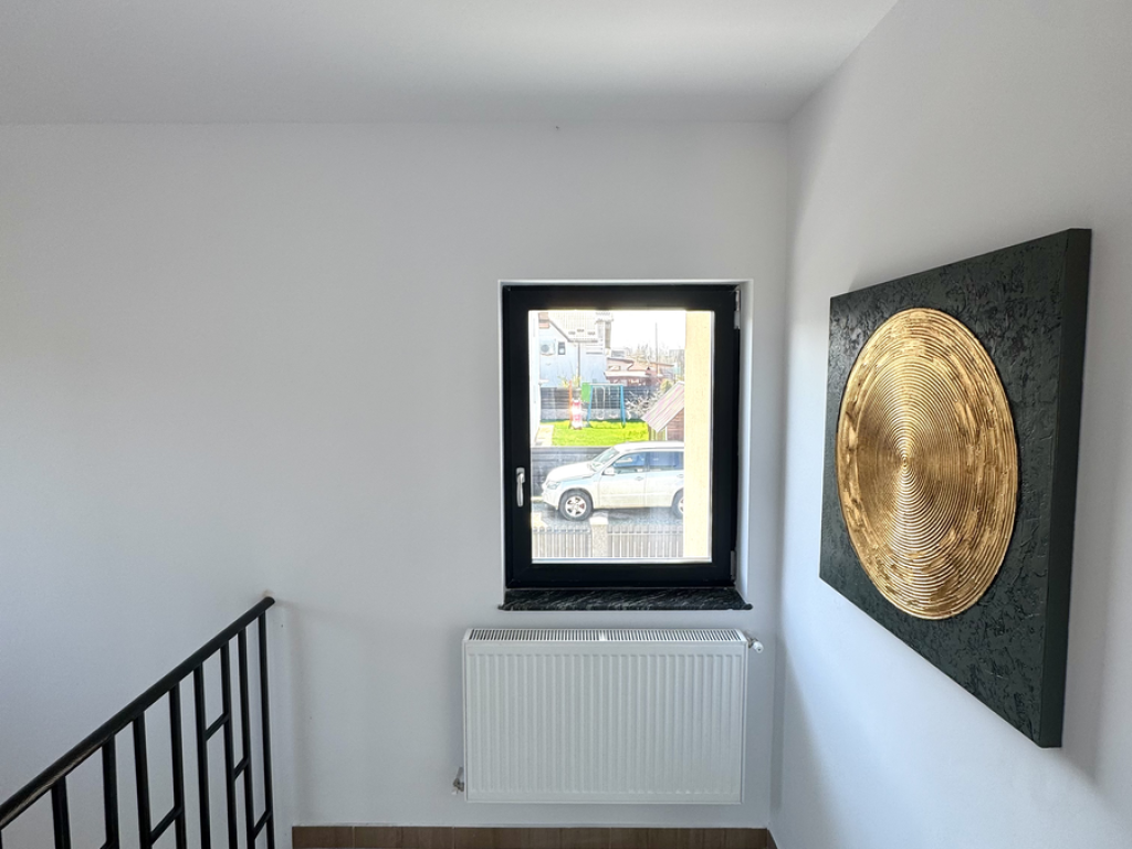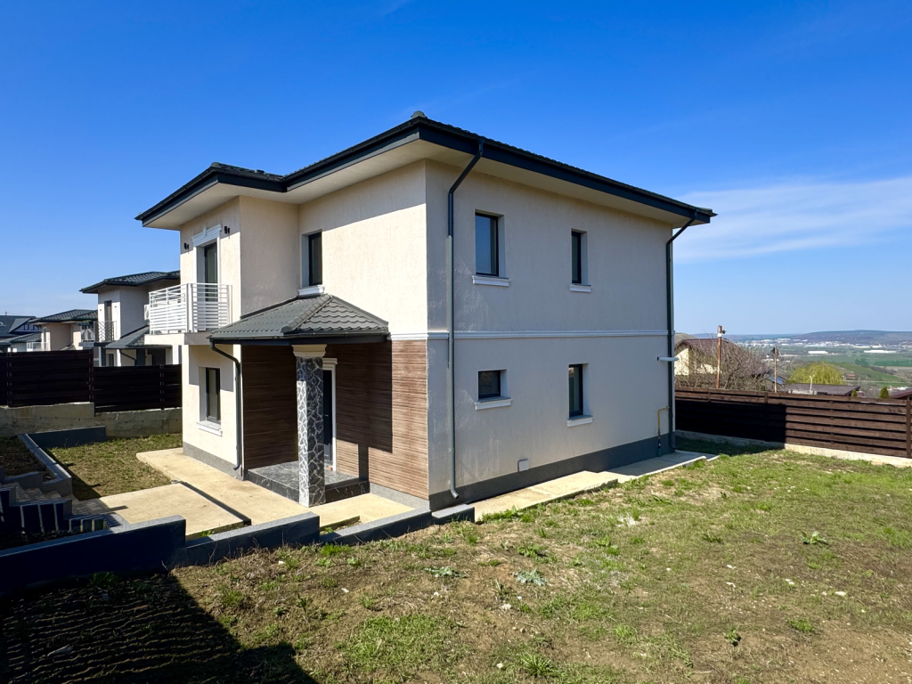 Va propunem spre vanzare o vila cu 4 camere, in Miroslava, la asfalt, la 1 minut de Primarie si Family Market, racordata la toate utilitatile, inclusiv canalizare, cu o fundatie din beton si zidarie din caramida, avand o suprafata utila de 118 mp si teren aferent constructiei de 440 mp, compartimentata astfel: