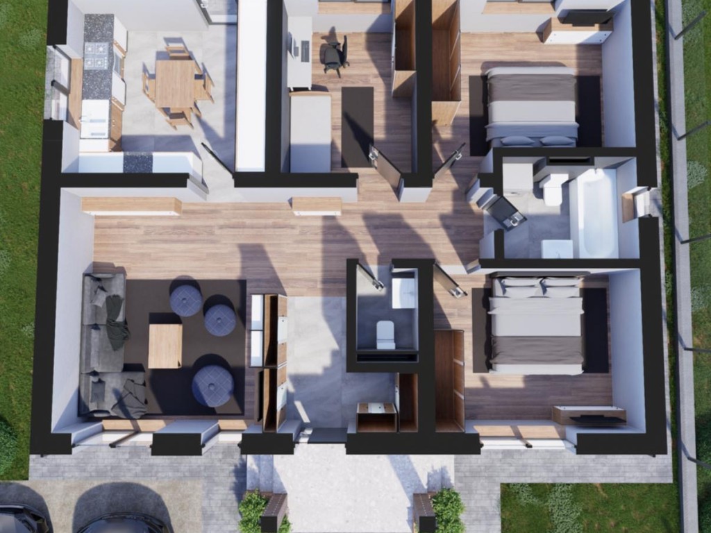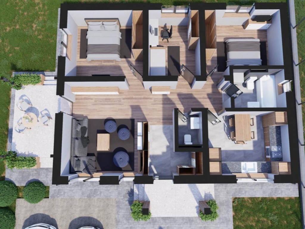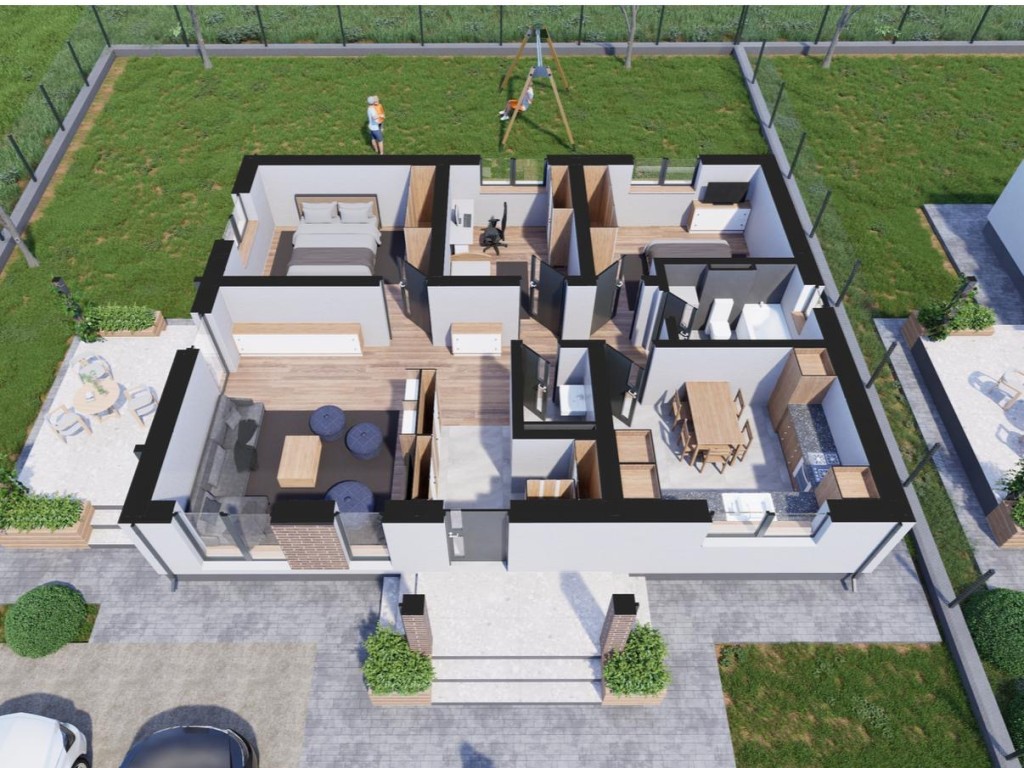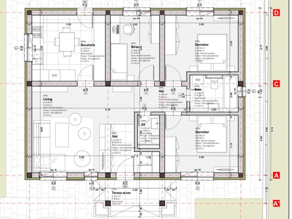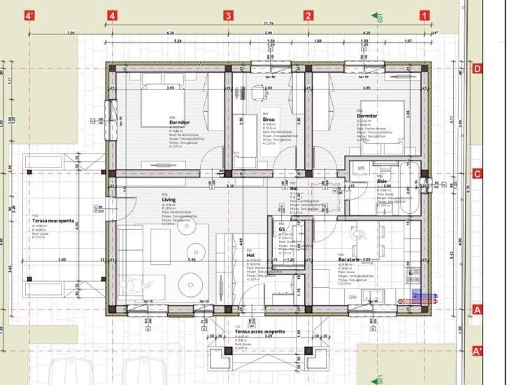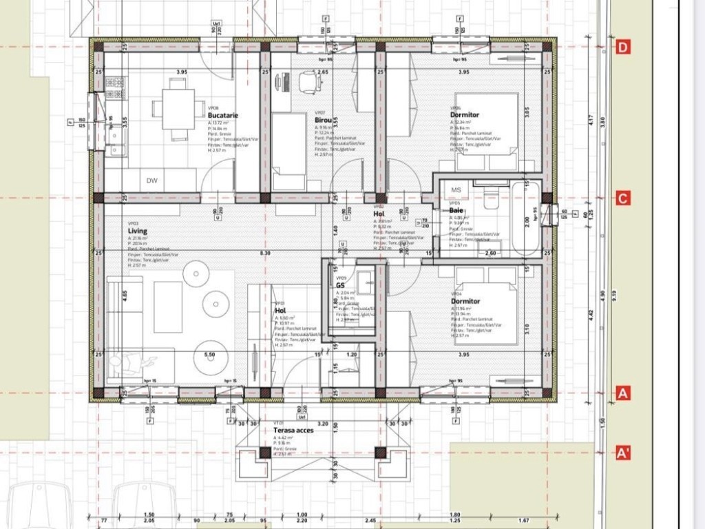 Parter: living, bucătărie, 3 dormitoare, 2 băi, hol, posibilitate de terasa