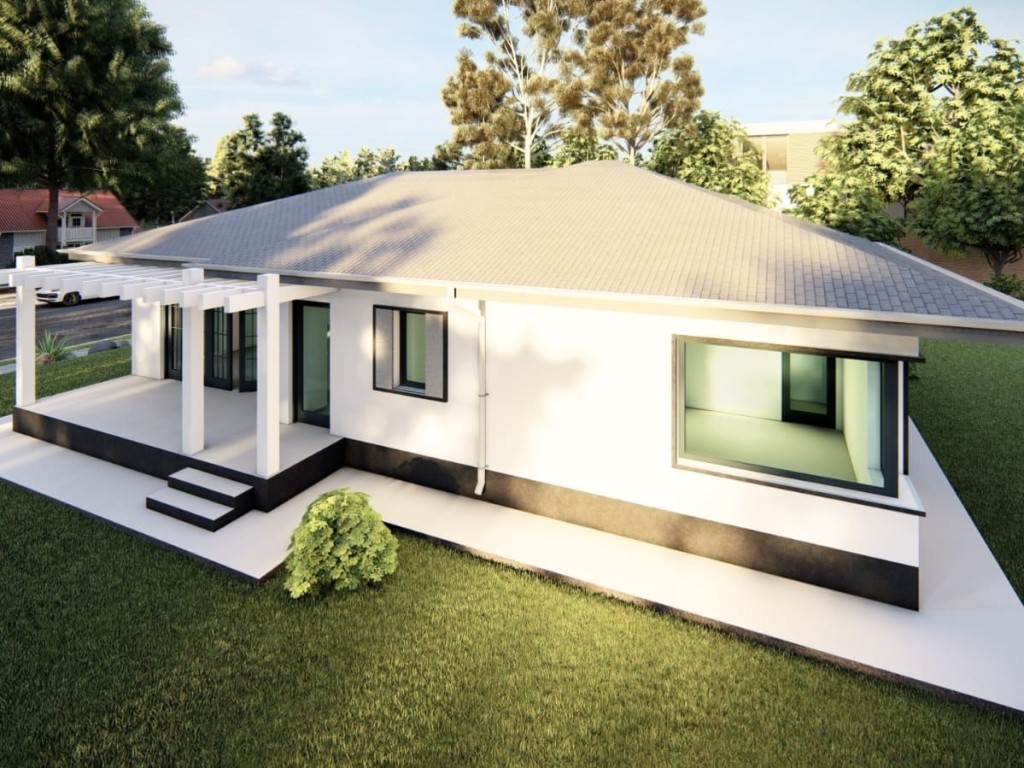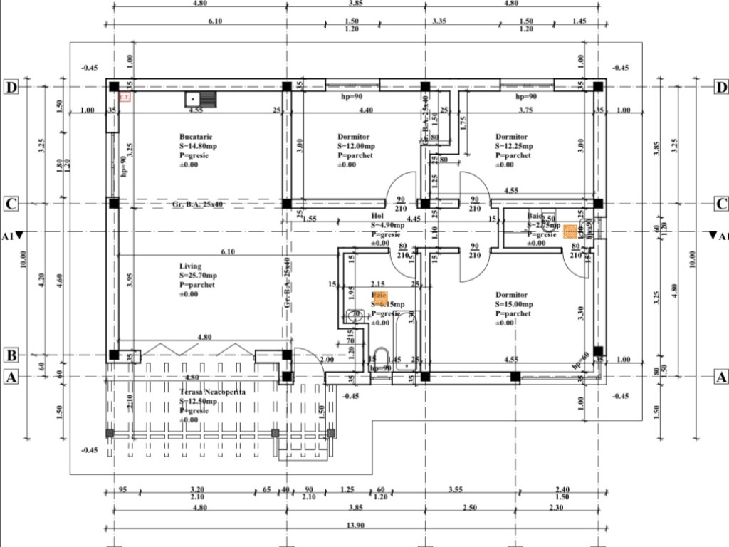Parter: living, bucatarie, 3 dormitoare, 2 bai, terasa